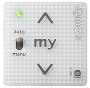 Mando de pared de la gama io. Tecnología táctil para interactuar de forma intuitiva con todas las aberturas de la casa. Memorización de una posición preferida apretando el botón "my" sencillo de programar y modificar. Función Auto/Manu local: Para aislar una persiana motor del mando general y/o automático.